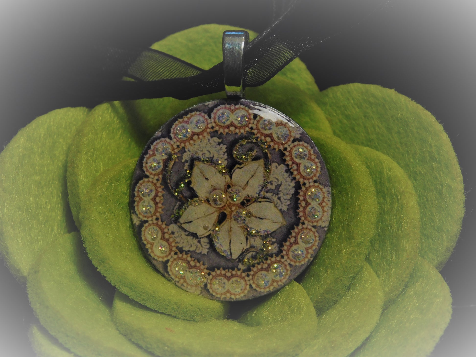 1.25-inch pendant with sterling silver bezel. Comes with your choice of colors for the included 17-inch ribbon cord necklace. 20-inch round cord necklace will have a $1.00 added charge. Both have a 2-inch extension chain and lobster clasp.