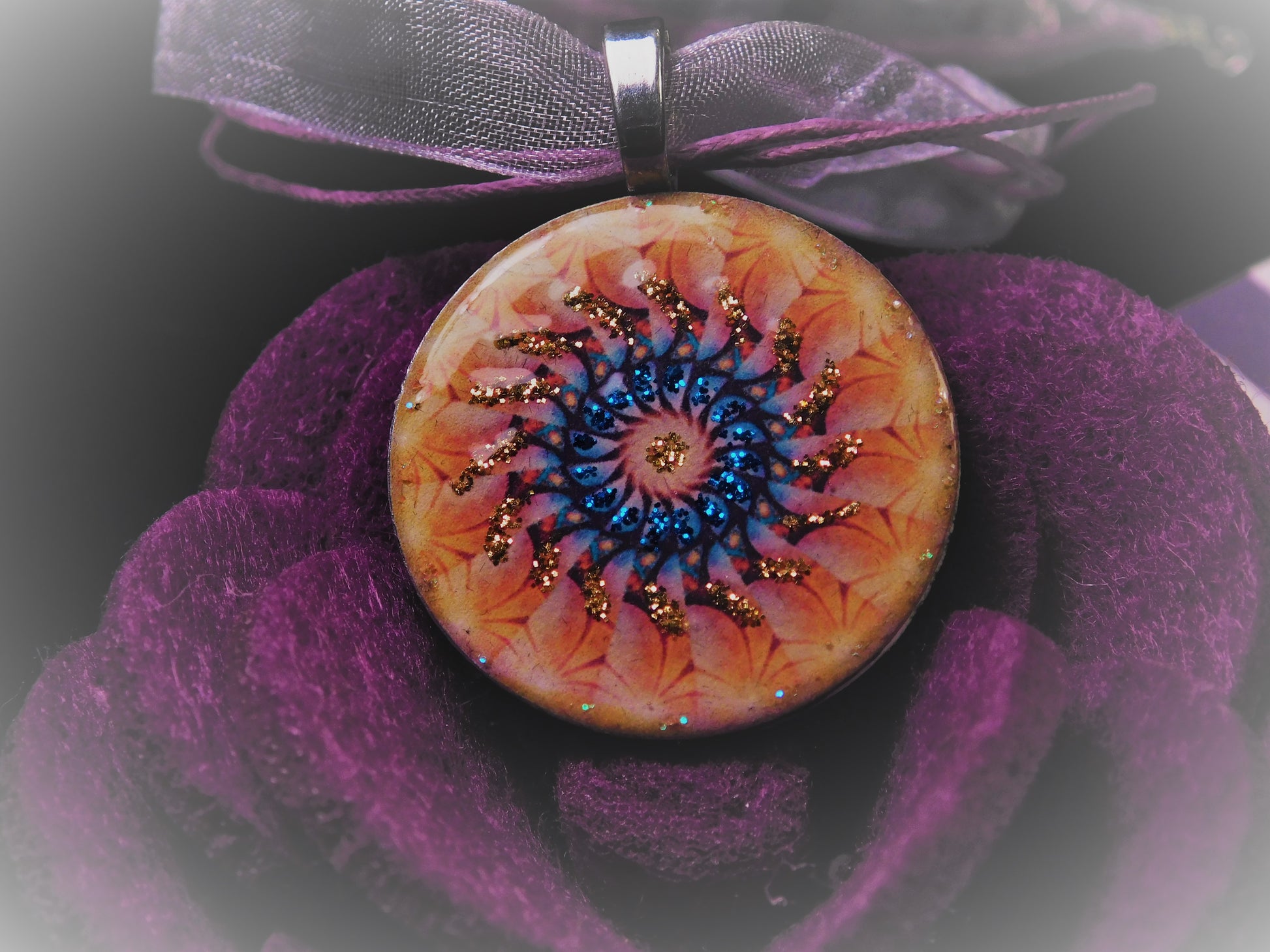 1.25-inch pendant with sterling silver bezel. Comes with your choice of colors for the included 17-inch ribbon cord necklace. 20-inch round cord necklace will have a $1.00 added charge. Both have a 2-inch extension chain and lobster clasp.
