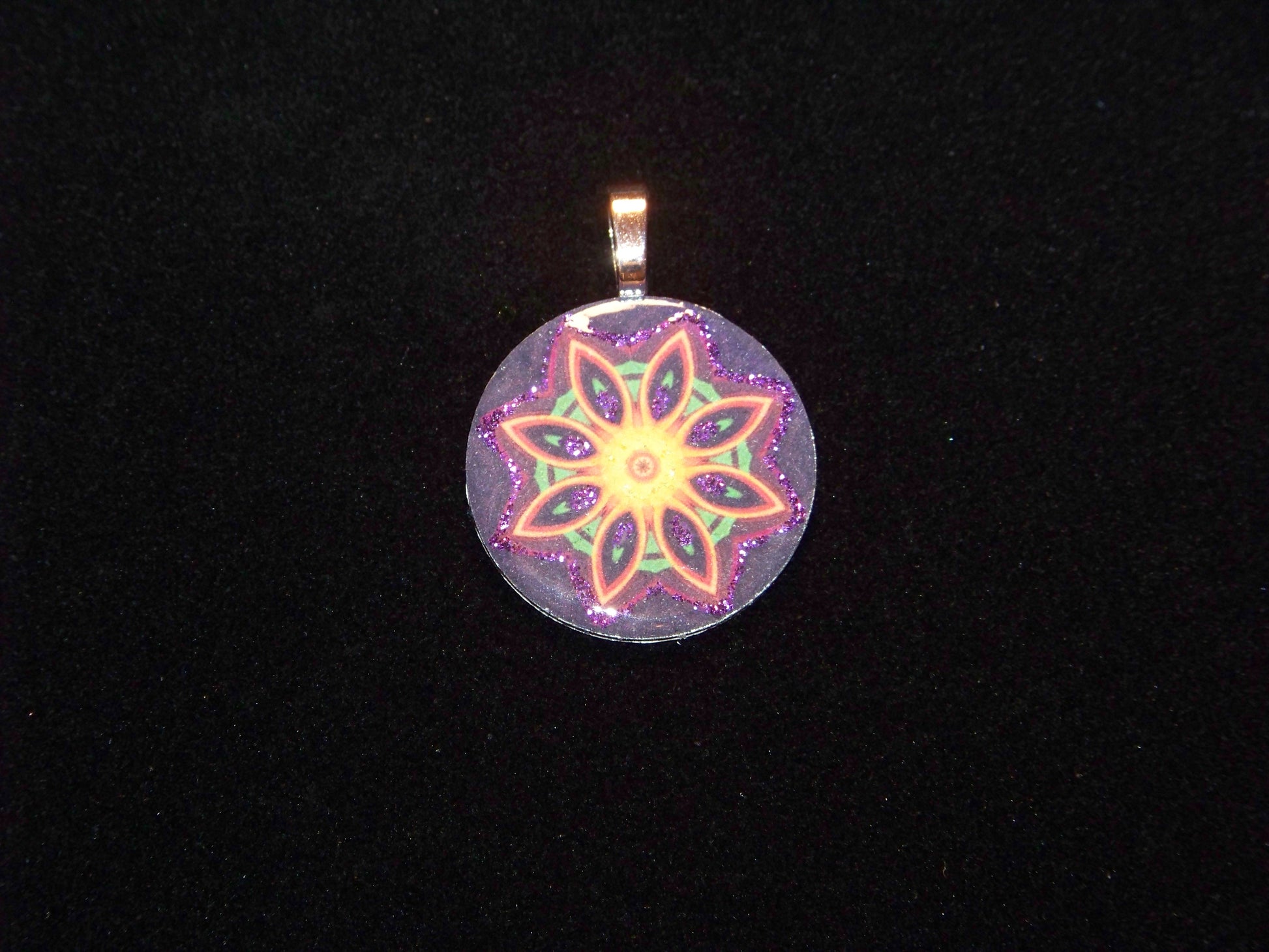 1.25-inch pendant with sterling silver bezel. Comes with your choice of colors for the included 17-inch ribbon cord necklace. 20-inch round cord necklace will have a $1.00 added charge. Both have a 2-inch extension chain and lobster clasp.