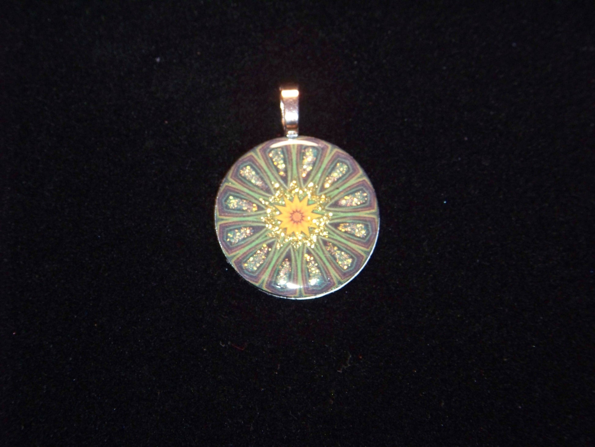1.25-inch pendant with sterling silver bezel. Comes with your choice of colors for the included 17-inch ribbon cord necklace. 20-inch round cord necklace will have a $1.00 added charge. Both have a 2-inch extension chain and lobster clasp.