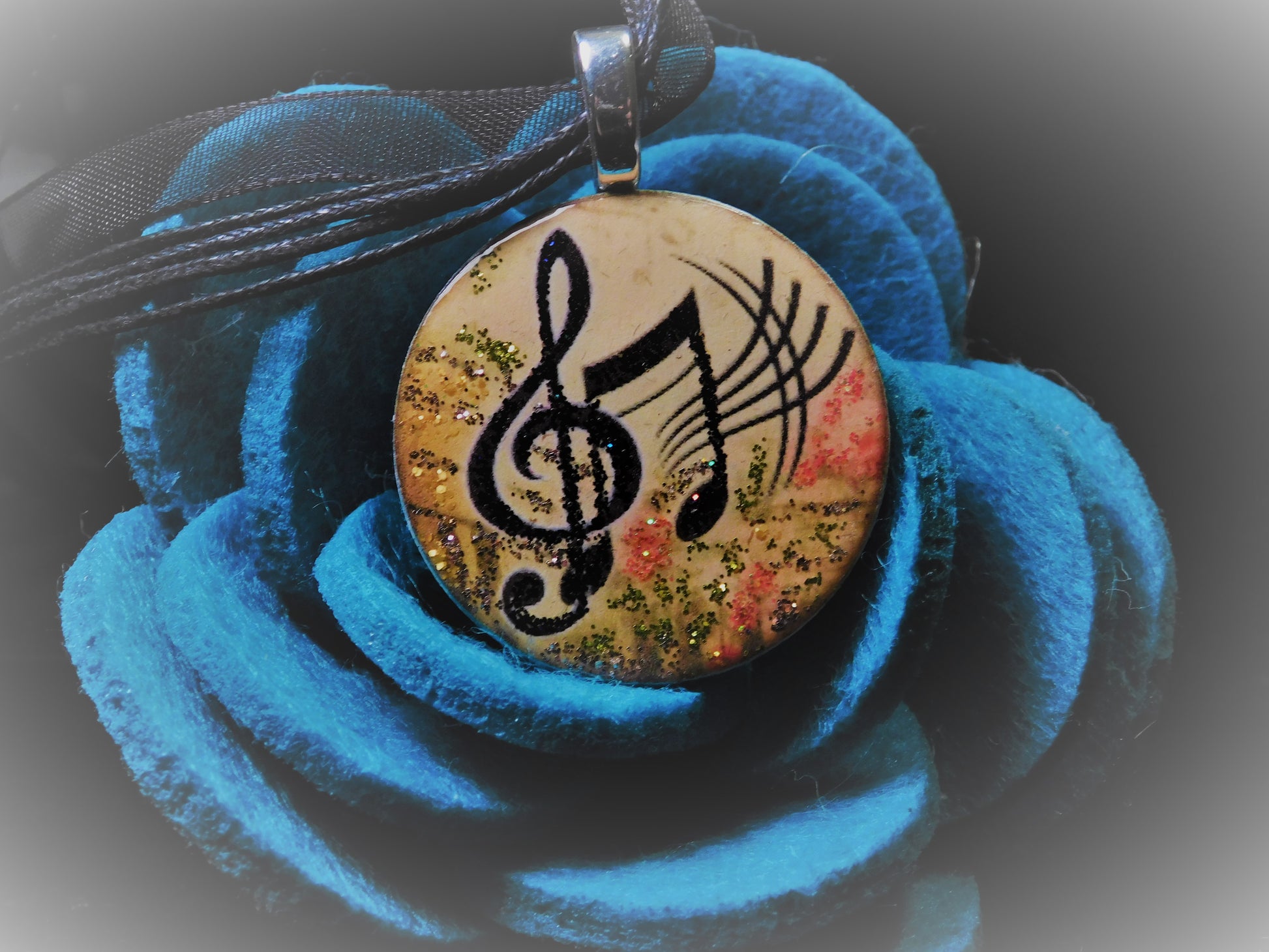 1.25-inch pendant with sterling silver bezel. Comes with your choice of colors for the included 17-inch ribbon cord necklace. 20-inch round cord necklace will have a $1.00 added charge. Both have a 2-inch extension chain and lobster clasp.